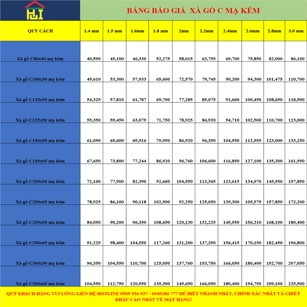 Sáng Chinh Steel BẢNG BÁO GIÁ XÀ GỒ C MẠ KẼM