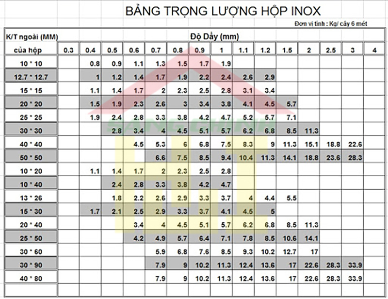 Bảng tra Barem ống, hộp inox gồm các loại theo kích thước tiêu chuẩn, phù hợp với nhiều loại công trình khác nhau.