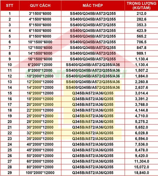 Bảng tra chủ yếu áp dụng cho các loại thép tấm và thép mạ kẽm dùng trong công trình xây dựng.