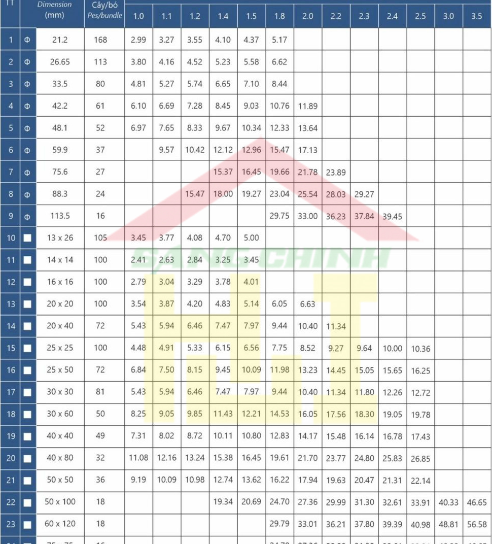 | Thép ống tròn | Ø21.3 x 2.3 | JIS G3452 | 1.41 | 20.500 - 22.500 |