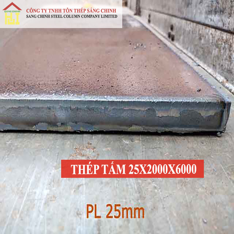 Đây là kích thước tiêu chuẩn của một tấm thép: độ dày 25 mm, chiều rộng 2000 mm và chiều dài 6000 mm. Kích thước này phù hợp cho việc cắt xẻ, tối ưu nguyên vật liệu trong nhiều mục đích sử dụng khác nhau.