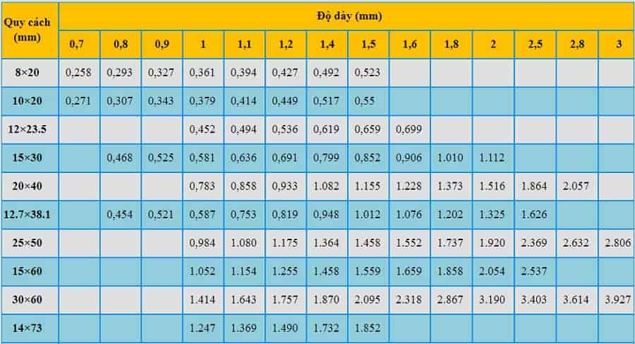 Kích thước (mm) Độ dày (mm) Tiêu chuẩn Trọng lượng (kg/m) Giá bán (VNĐ/cây)