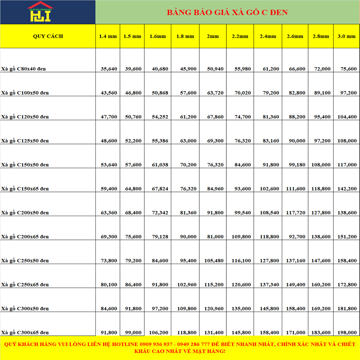 | Xà gồ C125x50 đen | 168 | 48,600 | 52,200 | 55,386 | 63,000 | 69,300 | 76,320 | 83,160 | 90,000 | 97,200 | 108,000 | ||||